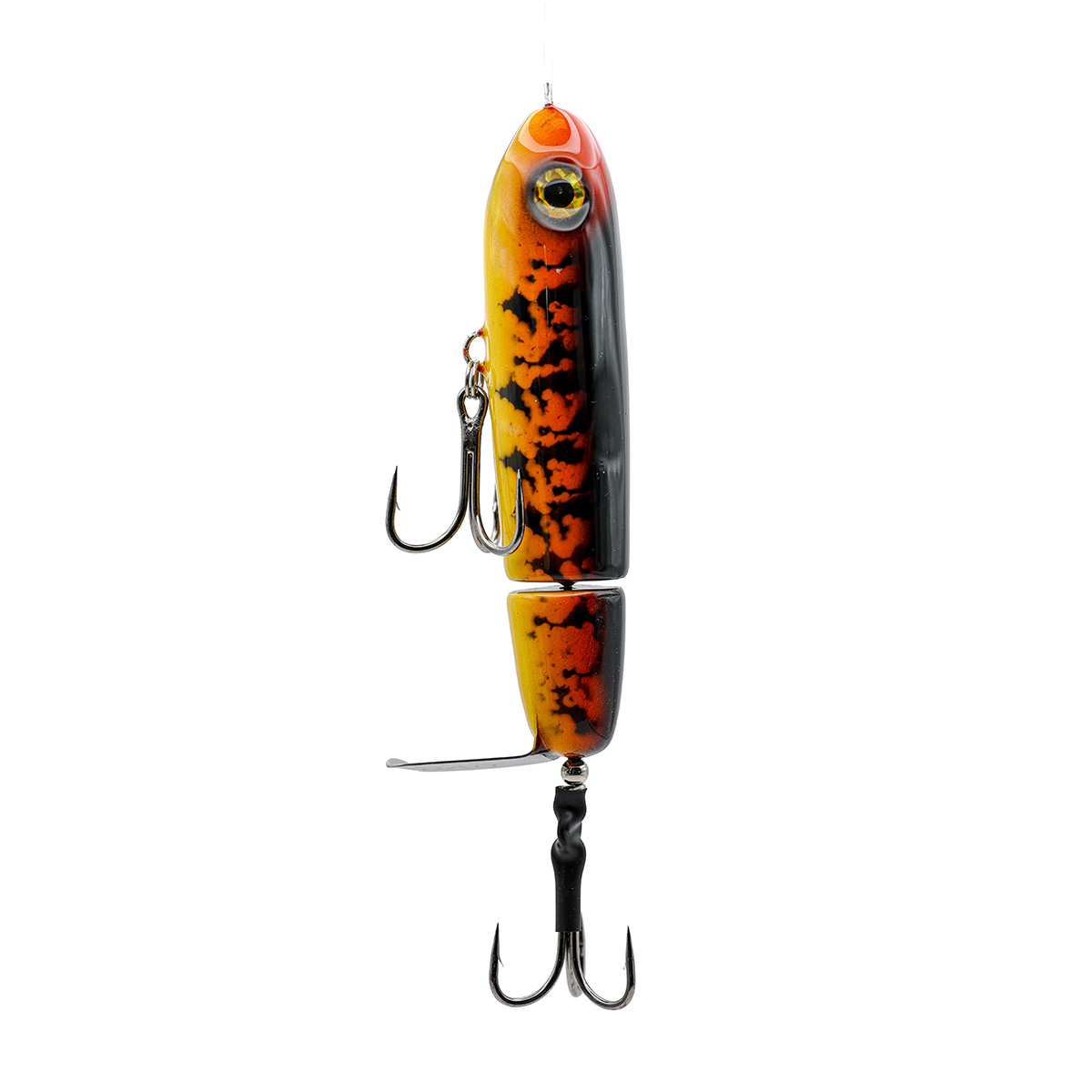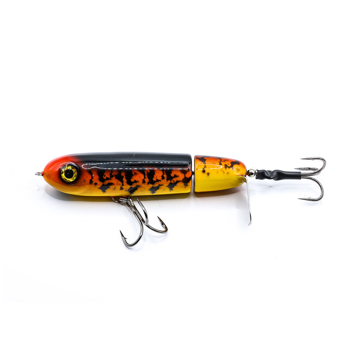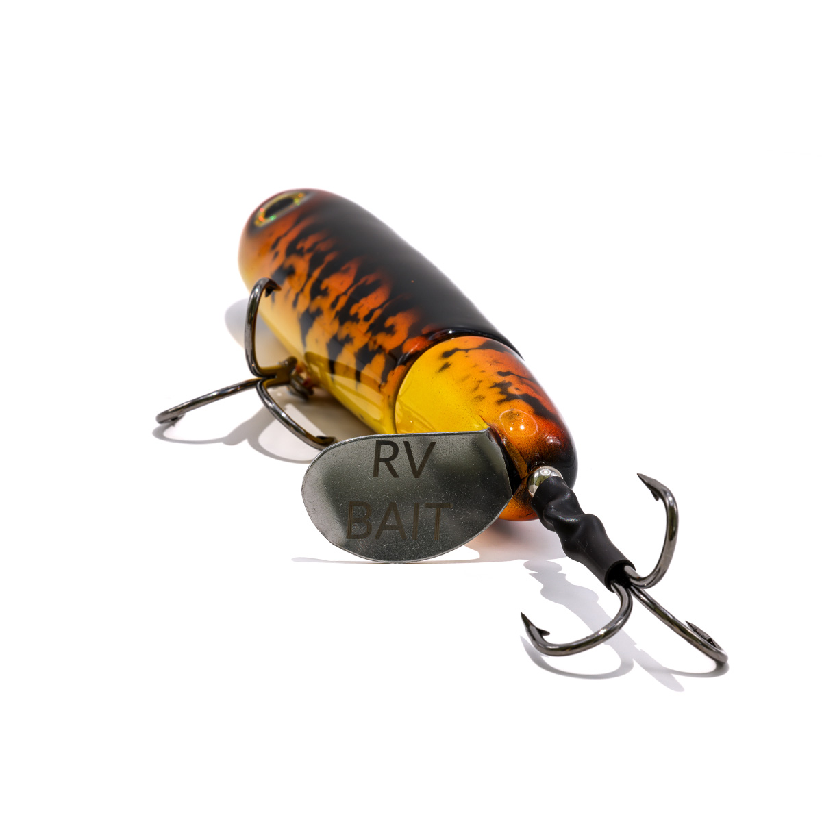 Having the shape of Walk of Death and the flexibility of Small Dog, the RV Bait is the best of both worlds. The RV Bait body is perfectly balanced, weighted, and carved with a lip, creating a popping noise to fool even the smartest muskie. Made with a jointed body for multi-directional flexibility, it offers a durable body to handle even the most stubborn trophy fish. Handmade and painted, Tom Harrison offers maximum quality and durability with the RV Bait.