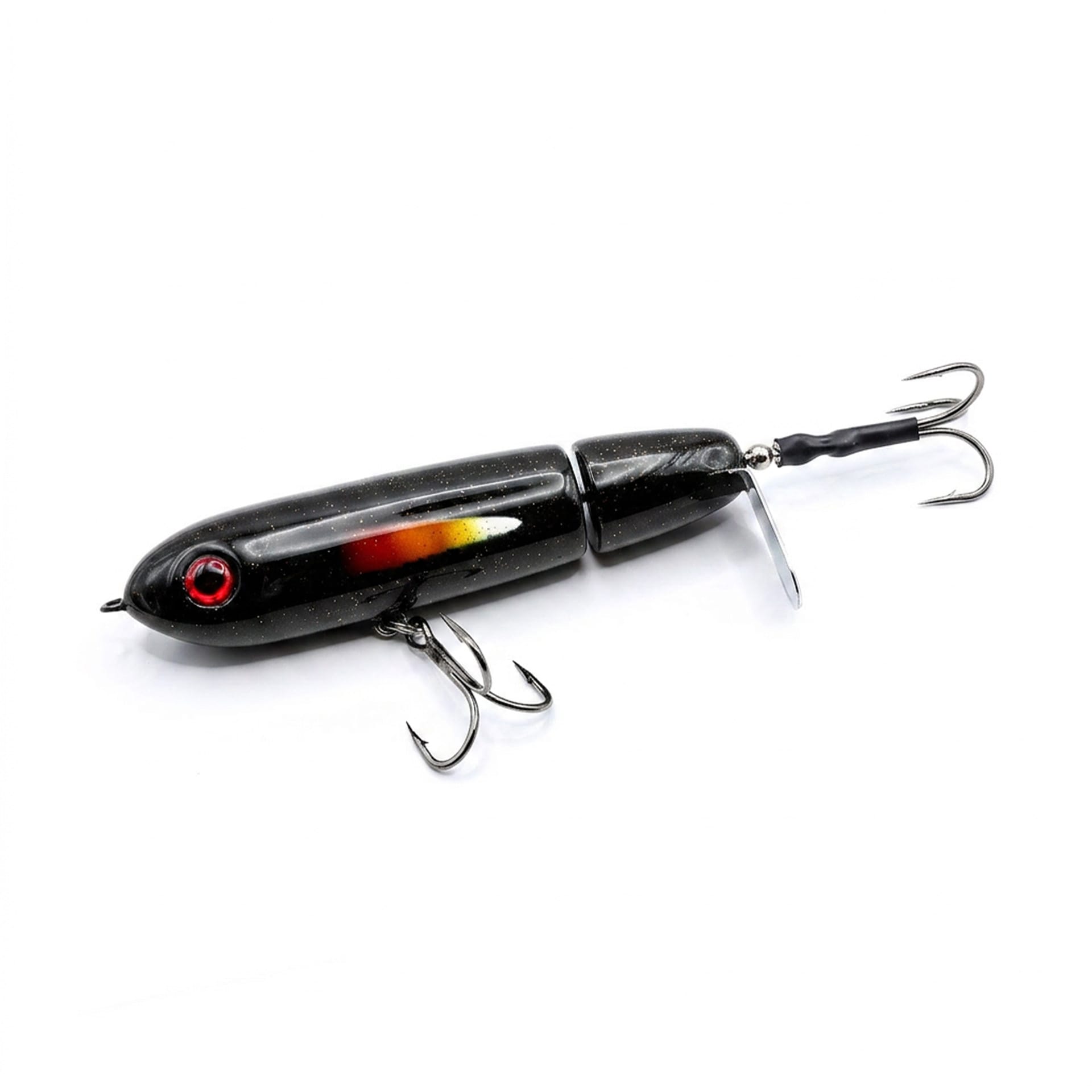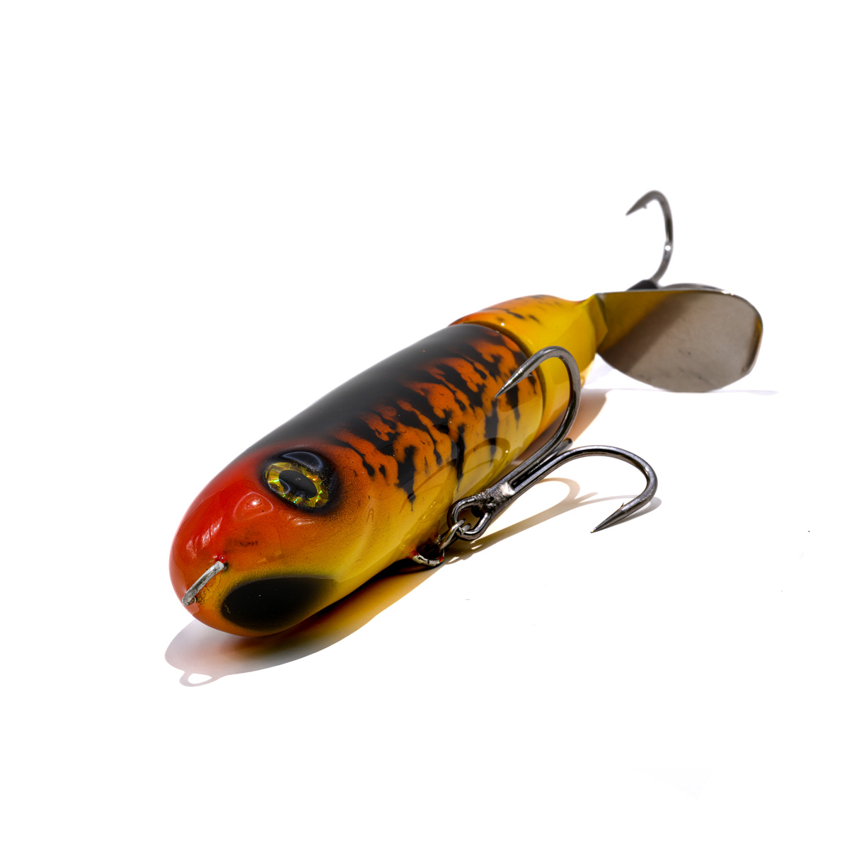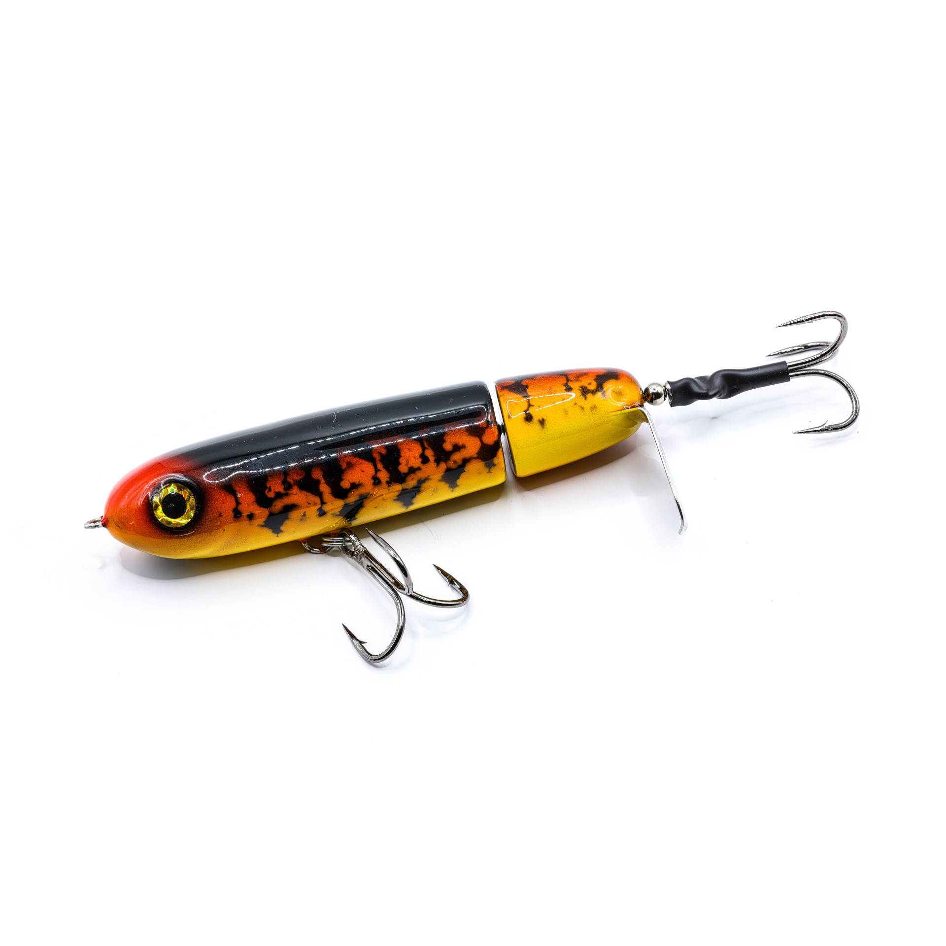 Having the shape of Walk of Death and the flexibility of Small Dog, the RV Bait is the best of both worlds. The RV Bait body is perfectly balanced, weighted, and carved with a lip, creating a popping noise to fool even the smartest muskie. Made with a jointed body for multi-directional flexibility, it offers a durable body to handle even the most stubborn trophy fish. Handmade and painted, Tom Harrison offers maximum quality and durability with the RV Bait.